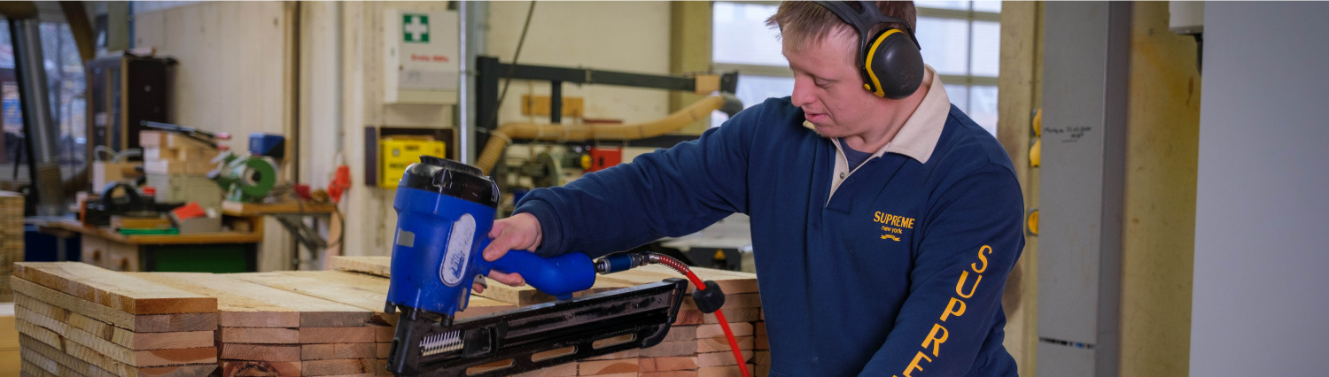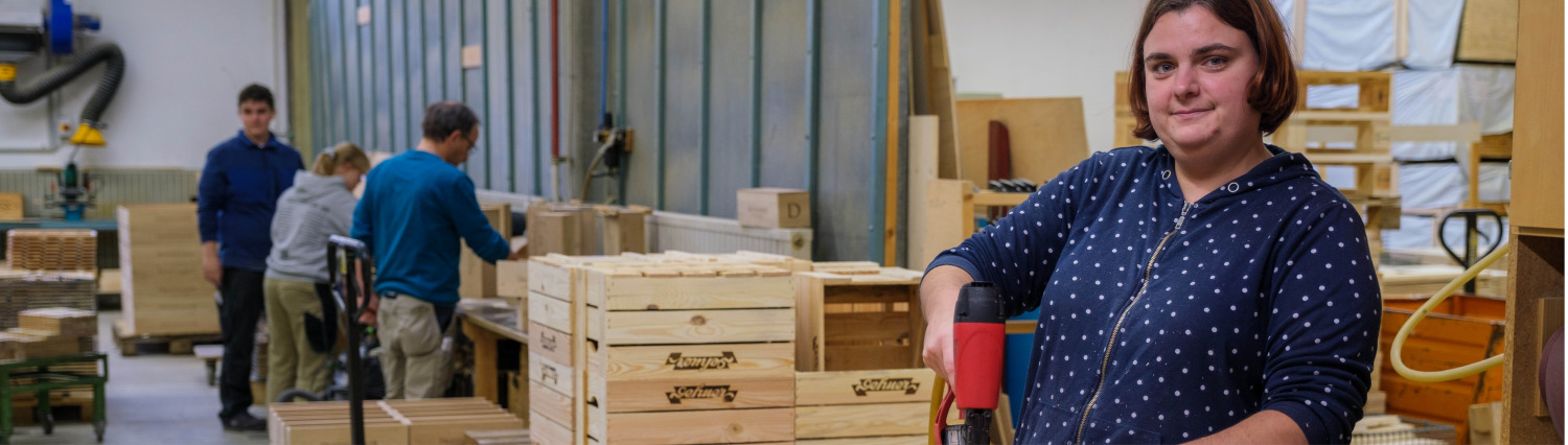 In unserer Holzwerkstatt arbeiten in vier unterschiedlichen Bereichen bis zu 40 Menschen mit Beeinträchtigung.